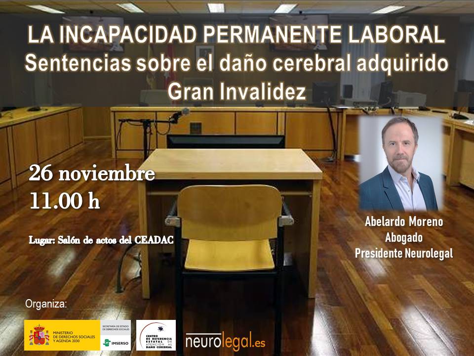 El próximo viernes 26 de noviembre de 2021 a las 11:00 h. tendrá lugar una Formación pionera en el Centro de Referencia Estatal de Atención al Daño Cerebral (Ceadac), dependiente del Imserso en Madrid, sobre “La Defensa de la Gran Invalidez por daño cerebral adquirido”, dirigido por el abogado Abelardo Moreno especialista en daño cerebral adquirido y presidente de la Asociación Neurolegal. Se trata de un tema de gran interés para los derechos de las personas afectadas, así como para sus familias, al reconocerse el complemento económico de ayuda en la situación de gran invalidez.